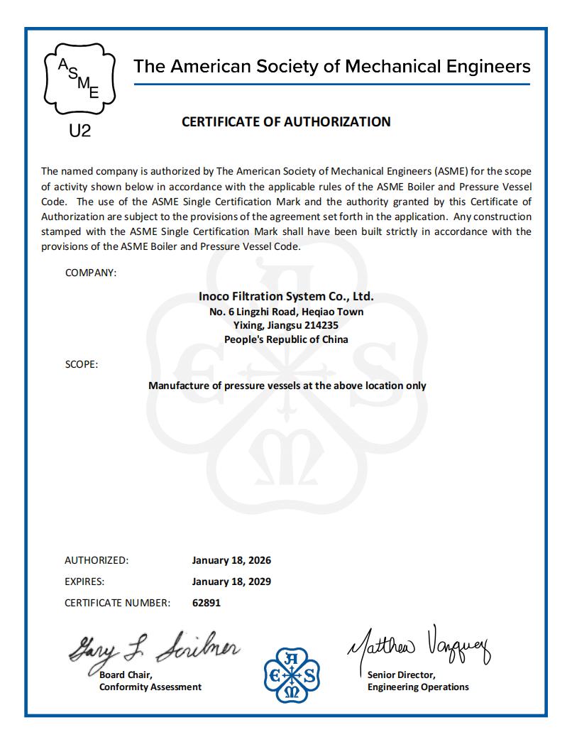 2026年1月,伊诺特顺利通过美国机械工程师协会(ASME)联检组严格审核,正式获得ASME U2 钢印认证,标志着伊诺特在高压压力容器类过滤设备的设计、材料、焊接、制造与质量管控体系,全面符合 ASME BPVC VIII-2规范要求,具备面向全球高端市场提供合规承压过滤装备的能力。