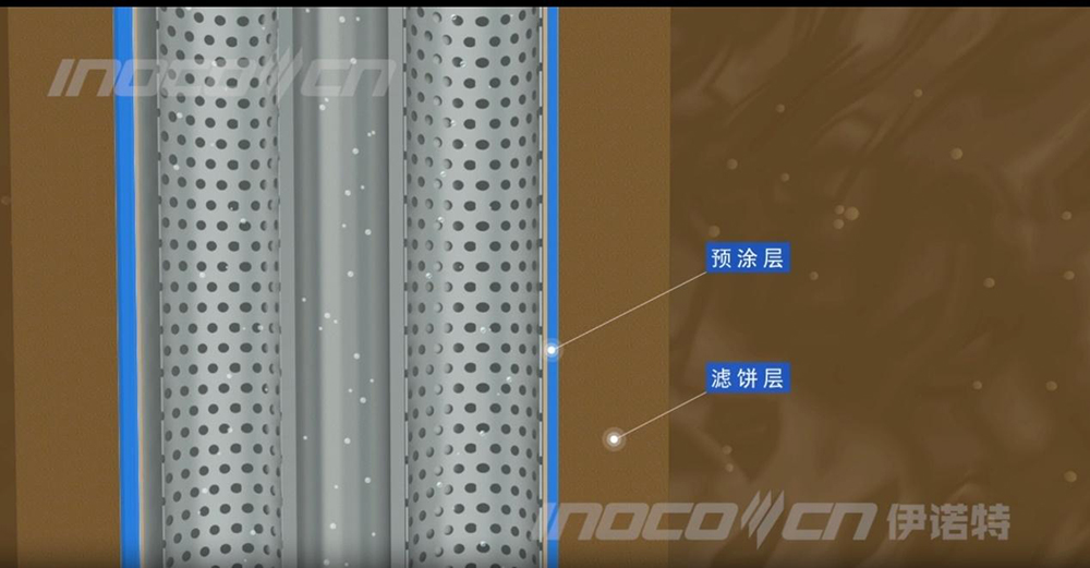 带有催化剂的料液由滤器外部进入, 由外向内通过滤材, 比滤 孔大的杂质被撞拦截下来,积累在滤材的表面形成滤饼,通过 搭桥作用,滤饼能够捕捉水中的一些更细小的杂质, 当杂质积 累到一定程度,压差上升到系统设定值,进出口流体阀关闭, 压缩气体进入并干燥滤饼,在反吹过程中,反吹气体将杂质排出, 滤芯得以再生。